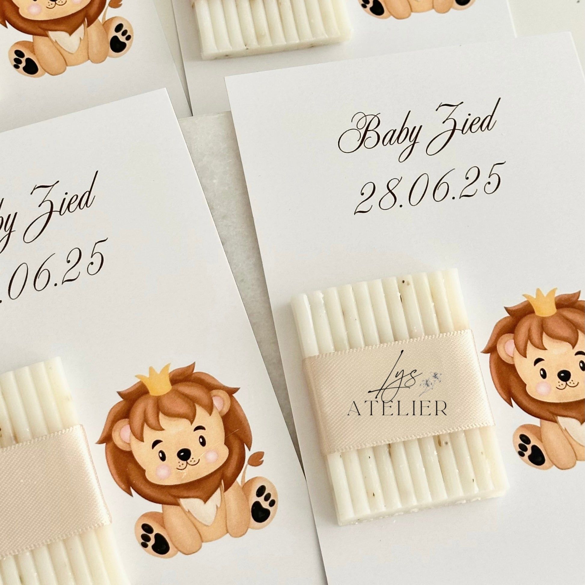 Le prix comprend la personnalisation ainsi que l’impression de la carte ainsi que le savon décoré.