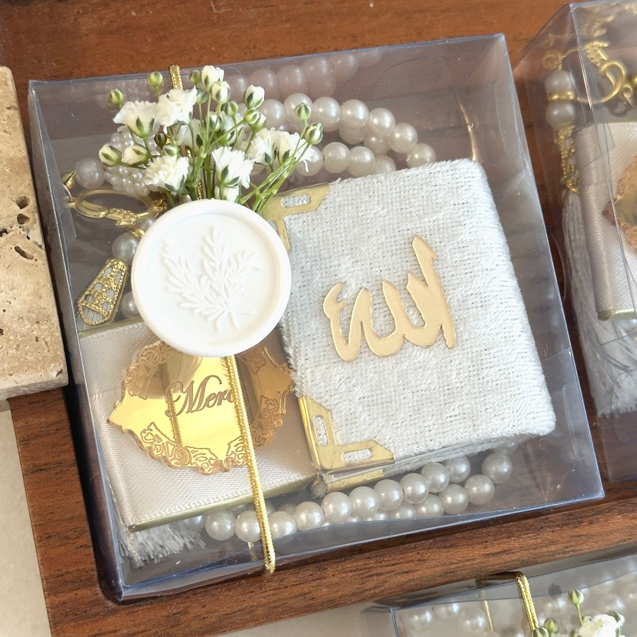 Coffret composé de : un tesbih en perles, un chocolat personnalisé au lait, un mini coran en arabe.